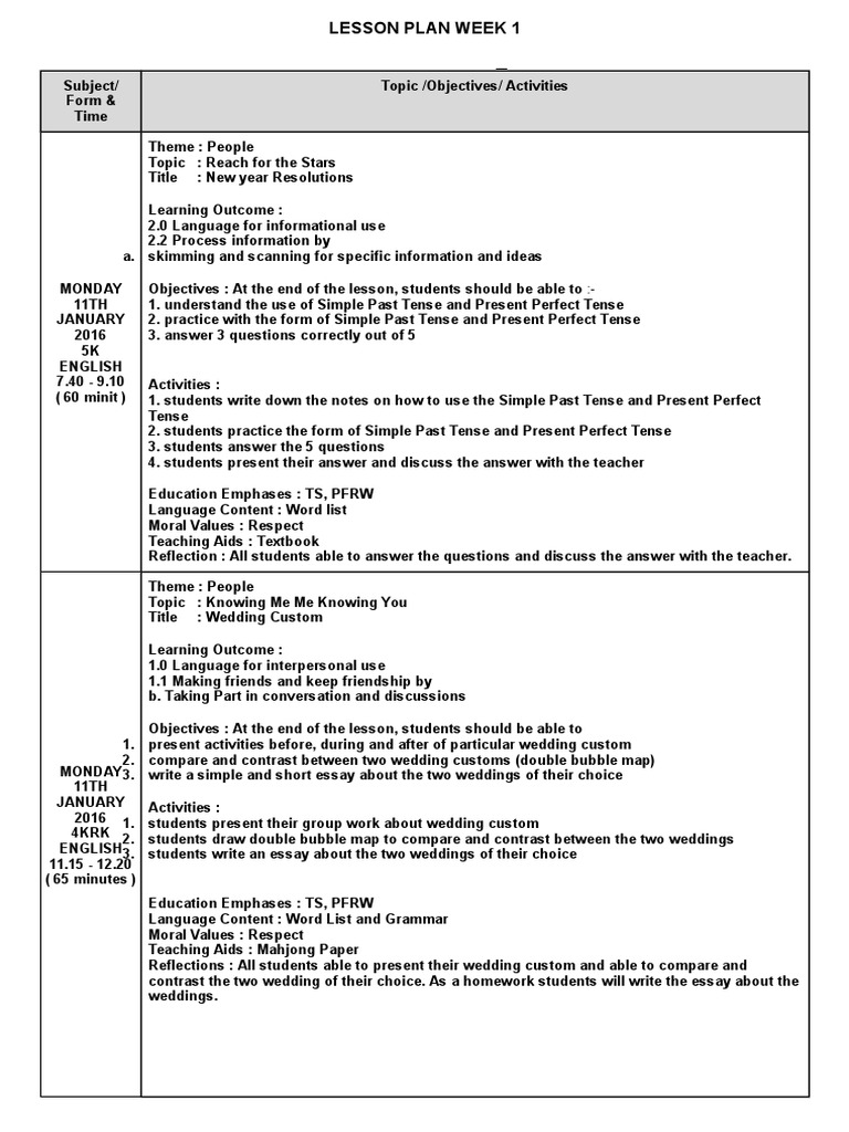 Week 1 Lesson Plan Grammatical Tense